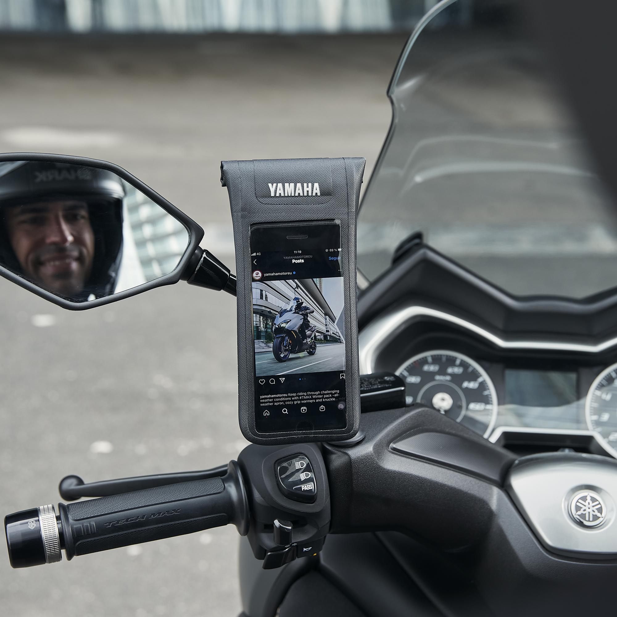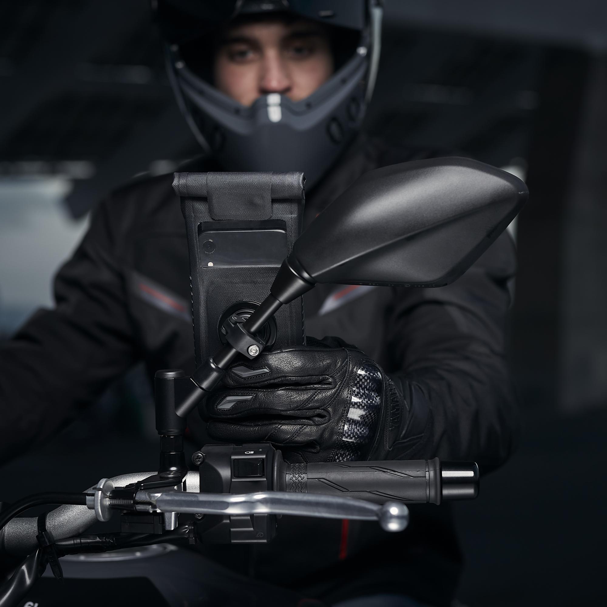 Mit der Universal-Telefontasche können Sie so gut wie jedes Smartphone (max. angegebene Telefongröße) an einer der Halterungen verwenden, um Ihr Telefon an Ihrem Motorrad oder Roller zu befestigen. Mit seinem Drehverschlussmechanismus zur Befestigung. Schieben Sie das Smartphone einfach in das Gehäuse, schließen Sie die Öffnung mit der Lasche. Auf diese Weise bleibt Ihr Telefon vor Regen, Schweiß, Schlamm und Staub geschützt und bietet dennoch die volle Touchscreen-Funktionalität.